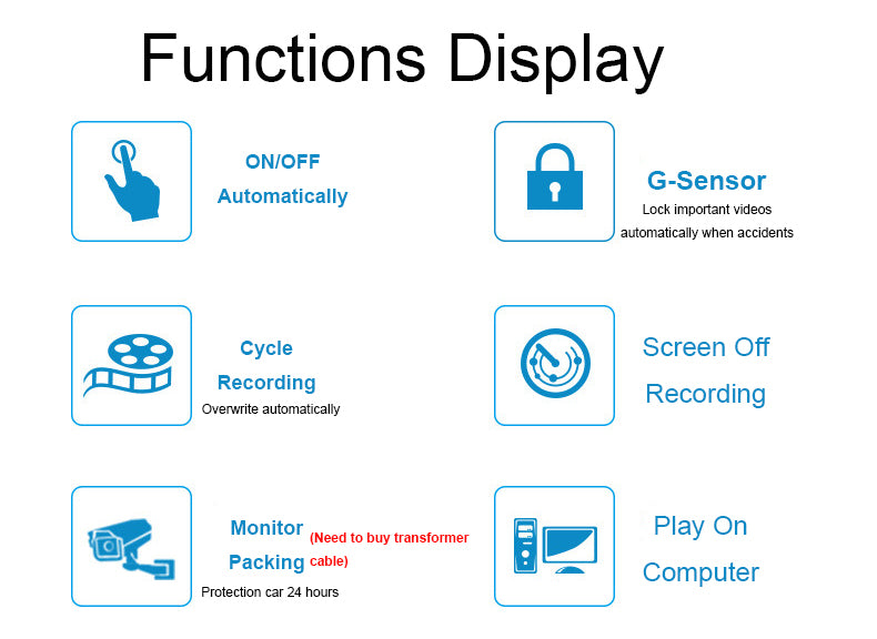 Special Features: Super Capacitors,Anti Fog,Digital Zoom,SD/MMC Card,Real Time Surveillance,Time&Date Display,Automatic White Balance,Cyclic Recording,With Ruler,Others,Microphone,Led Display,Motion Detection,Anti Vibration,Wide Dynamic Range,With Rearview Mirror,Anti Surge Voltage Impact,Cycle Recording,G-sensor,Dual Lens,Led Light,Waterproof